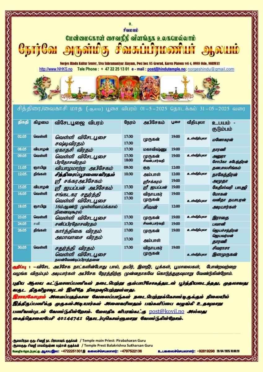 சித்திரை/ வைகாசி மாத பூஜை விபரம்