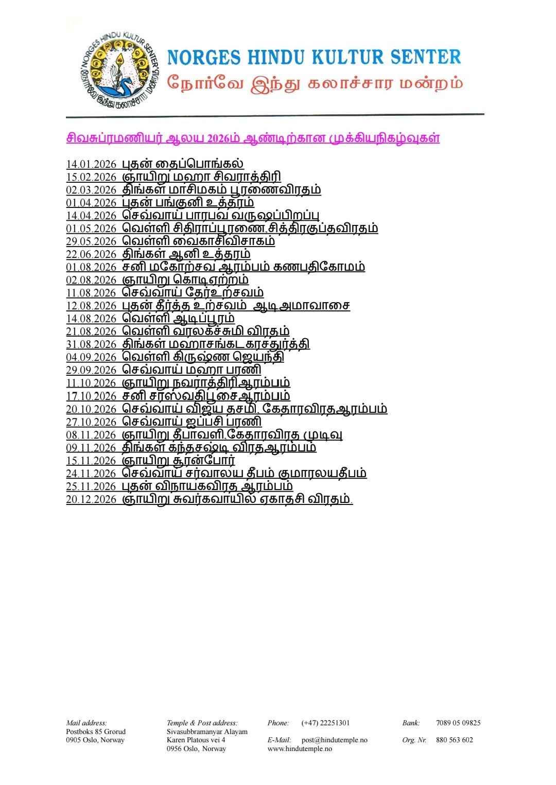 சிவசுப்ரமணியர்ஆலய2026 ஆம் ஆண்டு முக்கிய நிகழ்வுகள்